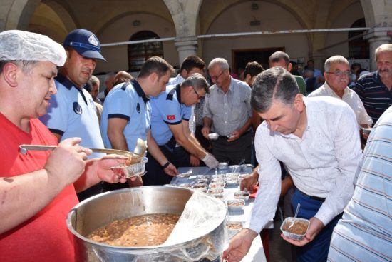 Daha sonra Belediye Başkan Vekili Ali Alper Boydak, camiden çıkan cemaate ve vatandaşlara kendi elleriyle aşure ikramında bulundu.