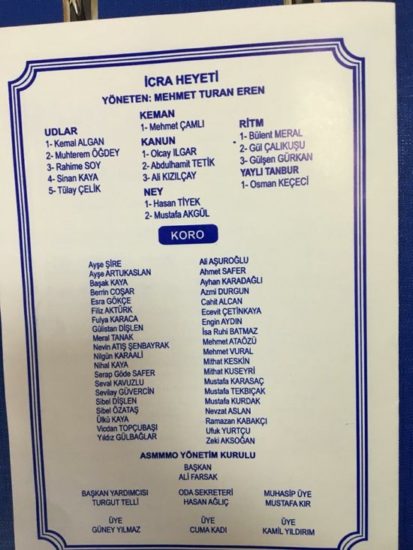 Serbest Muhasebeci Mali Müşavirler Odasının muhasebeciler günü dolayısıyla düzenlediği etkinlikte Türk Sanat Müziği Korosu sahne aldı Birbirinden güzel 25’e yakın parça seslendiren koro dinleyicilere bir müzik ziyafeti sundu Türk sanat müziği korosunda yer alan tecrübeli eğitimci özel Altıneller meslek lisesi’nin sevilen müdürü Ali Aşuroğlu’nu öğrencileri yalnız bırakmadı Türk sanat müziği resitalinden sonra hocalarına çiçek hediye edip, tebrik eden öğrenciler; hocamız gerçekten on parmağında on marifet olan bir insan Bize bu gün geçmişle geleceği harmanlayan Türk sanat Müziğiyle, seslendi adeta Onu örnek alıyor ve bizlerde onun yolunda ilerlemeyi hedefliyoruz Onun sayesinde Türk kültürünün müziği olan türk sanat müziğini çok sevdik diye konuştular