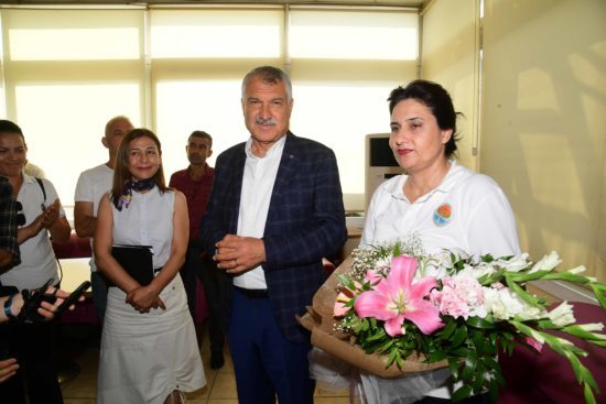 Adana Büyükşehir Belediye Başkanı Zeydan Karalar, Ulaşım Daire Başkanlığı Ulaşım Şube Müdürlüğü’nde ziyaret ettiği Zeliha Elbüken’e, insan hayatına önem vermesinden ötürü çiçek verdi, tam cumhuriyet altınıyla taltif etti.