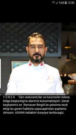 Açmış olduğu nezih restaurantla Adana'da yemek sektörüne hızlı bir giriş yapıp yeni bir soluk getiren Karı Kervan Kebap sahibi Biral Serttaş, TÜM RESTAURANTLAR VE TURİZMCİLER DERNEĞİ (TÜRES) Adana Şube Başkanlığına seçildi Konuyla ilgili açıklama yapan Serttaş, böylesine önemli bir göreve beni layık bulup, bana tevdi ettikleri ettikleri için herkese teşekkür ediyorum Görevimi layıkıyla yapmak için elimden gelen her gayreti göstereceğime kimsenin şüphesi olmasın Kısmet olursa kısa zamanda yapacağımız etkin çalışmalarla Adana'nın lezzetlerini dünyaya tanıtacağız dedi Konuyla ilgili görüş bildirenler vatandaşlar ise sn Biral Serrtaş'ın kısa zaman içinde yemek sektöründe işletmeciliği, ustalığı ile Adanalı'nın gönlünü fethetmeyi başardığını dile getirerek böylesine önemli bir görevi üstlenen Biral Serttaş'a başarılar dileyerek Adana'mızın yemek sektöründeki adını dünya geneline duyuracağına şüphemiz yok diye konuştular