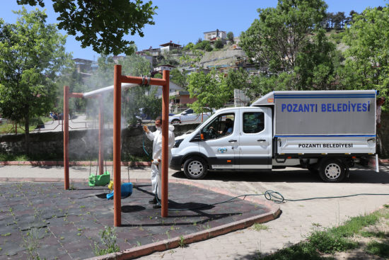 Koronavirüs tedbirleri kapsamında sokağa çıkma kısıtlaması getirilen çocuklara haftada bir gün izin verilmesi sonrası Pozantı Belediyesi harekete geçti. Sokağa çıkmalarına izin verilen 0-14 yaş grubu çocukların kendilerine oyun alanı olarak parkları seçmeleri üzerine belediye ekipleri, Belediye Başkanı Mustafa Çay’ın özel talimatı doğrultusunda kent merkezindeki çocuk parklarını baştan aşağı dezenfekte etti.