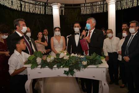 Büyükşehir Belediye Başkanı Zeydan Karalar da, genç çifti kutlayarak, Atatürk ilkelerine bağlı, cumhuriyet değerlerini benimsemiş çocuklar yetiştirmelerini istedi. Daha sonra Zeydan Karalar ve Soner Çetin evlilik cüzdanını birlikte genç çifte verdi.