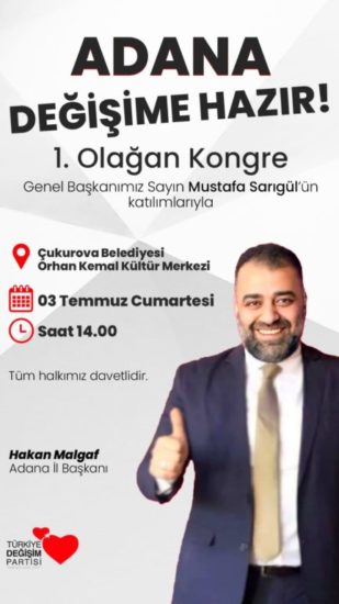 Türkiye Değişim Partisi Adana İl Başkanı Hakan Malgaf Cumartesi günü yapılacak kongreye tüm TDP severleri davet etti Cumartesi günü demokrasi şöleni yapacağız diyen Hakan Malgaf, Kongremize Genel Başkanımız Sn Mustafa Sarıgül, Genel Başkan Yardımcılarımız tüm ana kadro teşrif ederek Adana'mızda halkımızla buluşacak Bu da partimizin Adana'mıza duyduğu güvenin verdiği önemin göstergesidir Bizde bu güvene layık olmak için var gücümüzle kongre hazırlıklarımızı sürdürüyoruz İnşallah Cumartesi günü kongre salonumuzu doldurarak Genel Başkanımız sn Mustafa Sarıgül'ü layıkıyla karşılayacağız Ülkemizin tünelden önceki son çıkış olarak gördüğü Türkiye Değişim Partimizin kongresine tüm Adana'lıları bekliyoruz dedi