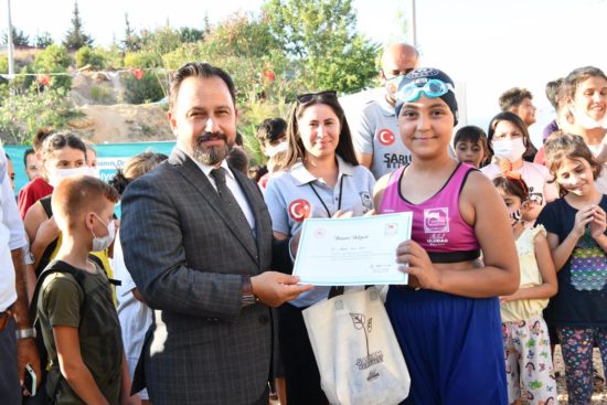 Öte yandan sertifika töreninde yüzme kursuna katılan öğrenciler arasında mini bir de yarışma yapıldı. Sarıçam Belediye Başkanı Bilal Uludağ’ın çaldığı start düdüğü ile kıyasıya mücadele eden sporcuların performansı ortaya renkli görüntülerin çıkmasına neden oldu. Yarış sonunda başarılı olan öğrencilere çeşitli ödüller verildi.