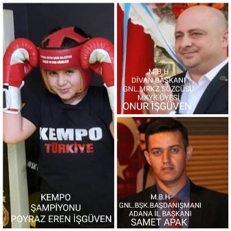 Milli Beka Hareketi Genel Başkan Baş Danışmanı ve Adana İl Başkanı Samet Apak'ın yeğeni, Milli Beka Hareketi Genel Merkez Divan Kurulu Başkanı Onur İşgüven’in de oğlu Poyraz Eren İşgüven’ Kempo Dünya Şampiyonası'nda 9 yaş klasmanında üçüncü oldu Milli Beka Hareketi Adana İl Başkanı Samet Apak ve Yönetim Kurulu Üyeleri Kempo Dünya Şampiyonası’nda 3. Olan Poyraz Eren İşgüven’ i tebrik etti.