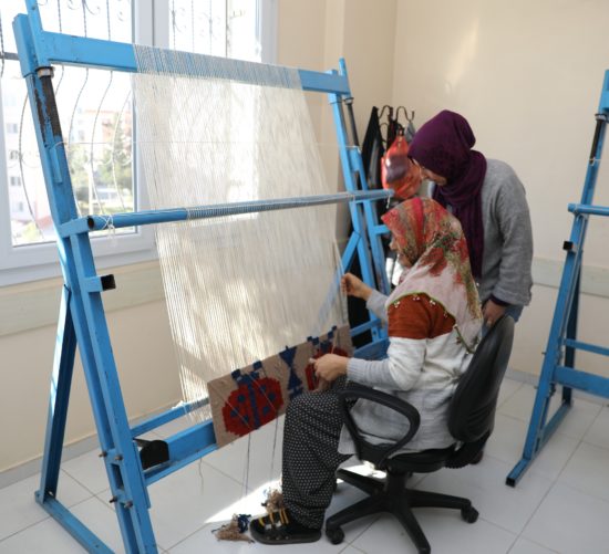 Ulubatlı Hasan, Fatih Terim ve Murat Göğebakan Kültürevlerinde verilen Halı Kilim Dokumacılığı Kursu’na Yüreğirli kadınlar ilgi gösteriyor. İpleri boyama, dokuma araç gereçlerini kullanma, halı dokumaya hazırlık yapma, halı kilim dokuma ve dokumayı bitirme işlemlerini öğrenen kursiyerler kurs bitiminde sertifika almaya hak kazanıyor.