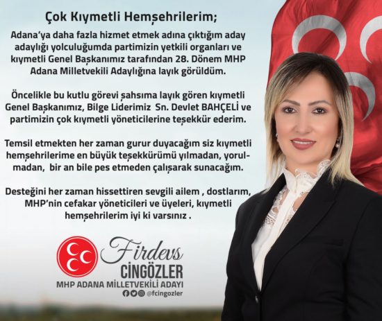 MHP Milletvekili aday listesi açıklandı Listede yer alan Adana Milletvekili adayı olan Adana'nın tanınmış saygın iş kadını Firdevs Cingözler Yaptığı açıklamada şunları söyledi