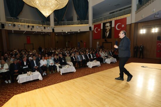 Söyleşide, Sunay Akın Atatürk’ün düşünce dünyasını, Cumhuriyet’in kazanımlarını ve tarihsel dönüm noktalarını etkileyici anlatımıyla dinleyicilere aktardı. Katılımcılar, sık sık alkışlarla Akın’ın konuşmalarına eşlik etti.
