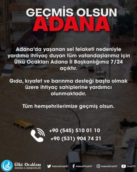 Adana’da meydana gelen şiddetli sel felaketinin ardından, Ülkü Ocakları Adana İl Başkanlığı yaraları sarmak için dev bir yardım operasyonu başlattı. Afetin ilk anlarından itibaren sahaya inen İl Başkanı Cem Tutsoy, sergilediği kriz yönetimi ve fedakârlığıyla takdir topladı
